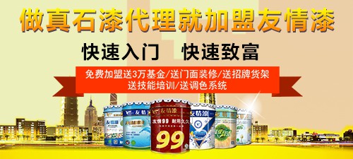 涂料十大品牌友情漆誠邀涂料加盟商,現(xiàn)加盟油漆代理即送30000元開店基金,獲得油漆廠家運營培訓指導,配備售后服務(wù)團隊,確保經(jīng)營100%收益