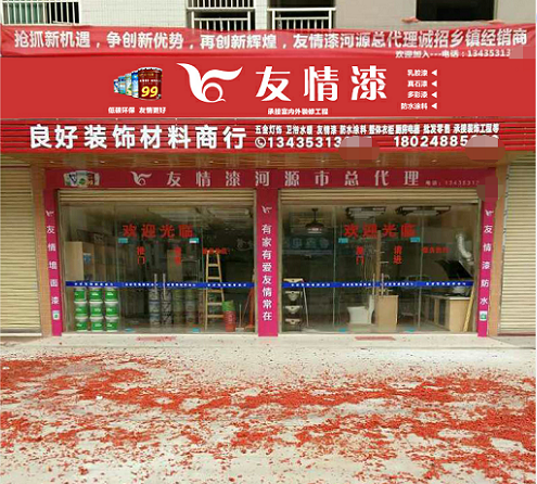 羅老板首先把友情漆河源總代理的店面,換了個新地址,擴大了門面規模,壯大了經營實力,確保為廣大客戶的產品銷售和服務供應,提供到強有力的保障。