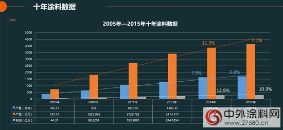 隨著過去十幾年中國城市化進程的飛速發展,中國涂料工業的高速發展,總體受益于房地產、家具等行業的快速發展。過去十年,中國涂料行業快速發展,實現了11.16%的年復合增長率。但是,隨著中國經濟逐步放緩,過去十幾年拉動涂料行業發展的主要動力——房地產、家具行業的忽冷忽熱,止步不前,中國涂料行業亦面臨增速放緩難題,中國涂料工業如何穩步發展,亦是思考。