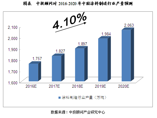 綜合以上因素,中投顧問發(fā)布的《2016-2020年中國涂料行業(yè)投資分析及前景預測報告》預計,2016年我國涂料制造行業(yè)產(chǎn)量將達到1,757萬噸,未來五年(2016-2020)年均復合增長率約為4.10%,2020年產(chǎn)量將達到2,063萬噸。