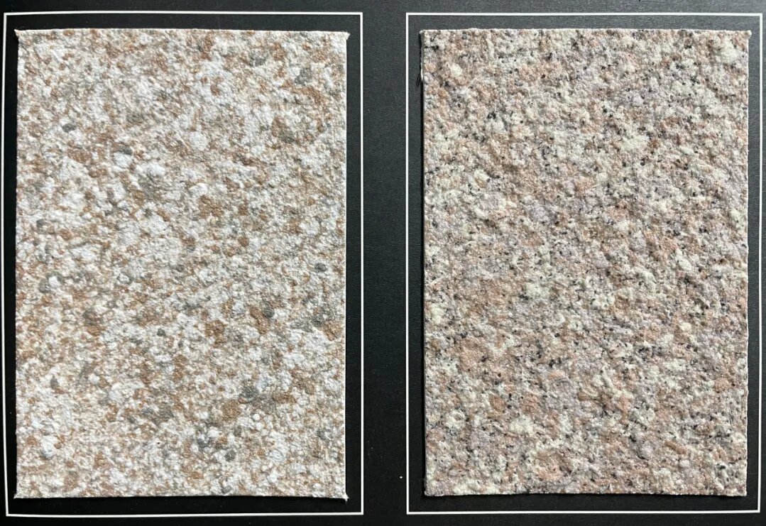 在墻體施工水泥砂漿時,預(yù)先測量規(guī)劃,填埋鋁合金線條或塑膠條,批平水泥砂漿層跟線條一樣高,完成后形成深槽效果。后續(xù)施工花崗巖漆無需再進行分割線施工。