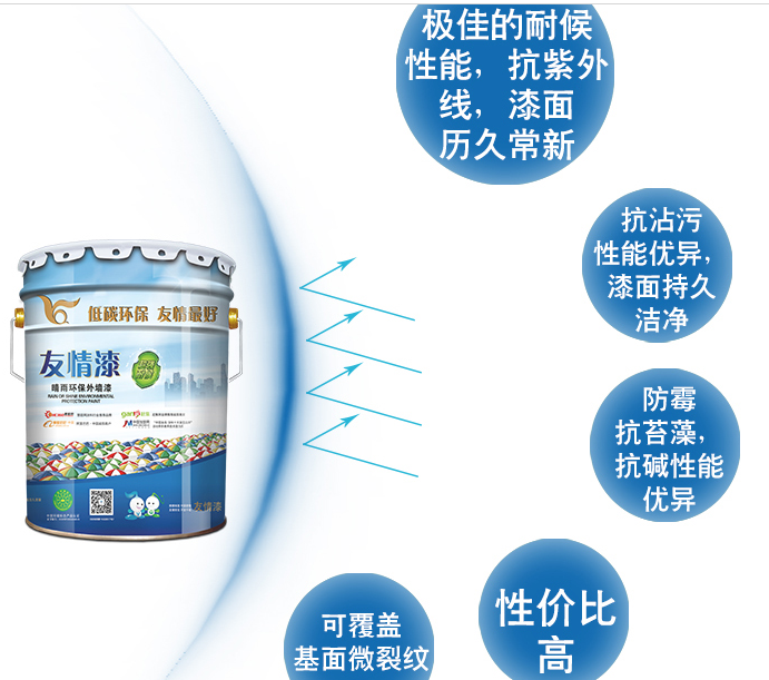 四、環(huán)保無毒無害。外墻漆產(chǎn)品成分基本是用乳液和粉劑,以及其他礦物成分兌水而成,在生產(chǎn)、施工和使用過程中,無論對人體健康,還是環(huán)境空間,無任何危害和污染,日后還可以自行降解。使得外墻漆既為人們樂意使用,更是政府提倡推廣的外墻裝飾材料。