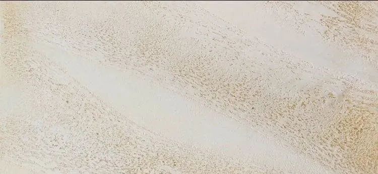 待7成干用4批刀側(cè)貼近表面刮出樹皮痕跡;刮到理想紋理后用棕毛刷清理干凈;批刀拋光洞石表面讓其表面手感光滑有光澤,涂釉彩。