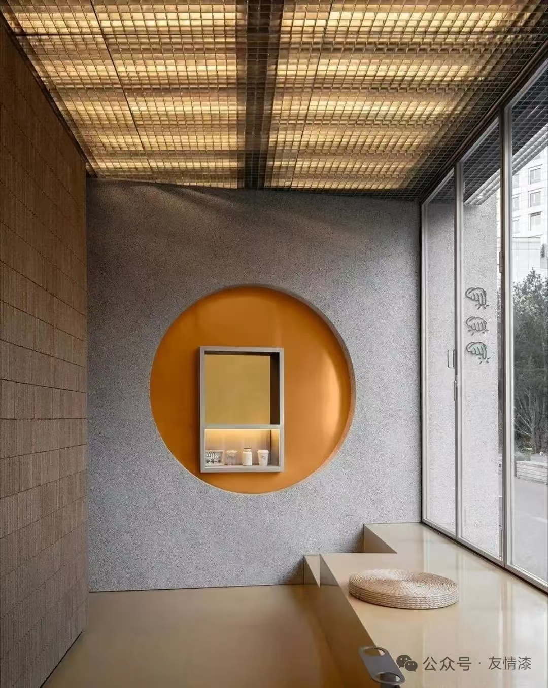 茶室墻面以米黃瑪拉彩石打底,點綴深色彩石顆粒,模擬歲月侵蝕的巖石質感。搭配原木家具與枯枝花藝,光線透過窗欞灑在墻面,傳遞出寧靜、質樸的東方禪意。